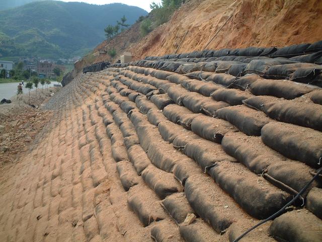 鋪設(shè)上一層:后續(xù)鋪層要在前一鋪層的基礎(chǔ)上進(jìn)行,以便每個(gè)上 層袋子用一個(gè)聯(lián)結(jié)扣固定在二個(gè)下層袋子上,這個(gè)扣就像餡餅的餡一 樣夾在上下層之間。形成一個(gè)聯(lián)結(jié)的表面粘連模式。繼續(xù)鋪設(shè)生態(tài)袋, 進(jìn)行壓實(shí)。上層的重量會(huì)牢牢的把三維排水聯(lián)結(jié)扣壓入袋子中,形成 袋與袋之間的堅(jiān)實(shí)聯(lián)結(jié)。在袋子上踩踏或在頂層夯實(shí)有助于確保袋子 之間的互鎖結(jié)構(gòu)緊密聯(lián)結(jié)。